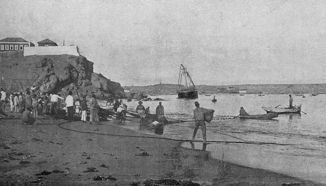 Mais uma foto sobre a pesca de "pesca do arrasto",  no início do século XX em Moçâmedes. É comum ler-se nos escritos da época que cães esfomeados andavam pela praia a aguardar que o peixe fosse trazido para terra para os abocanhar, porém eram muitos os animais aleijados pelas facas dos nativos que escalavam o pescado, caso estes animais se aproximassem demasiado.